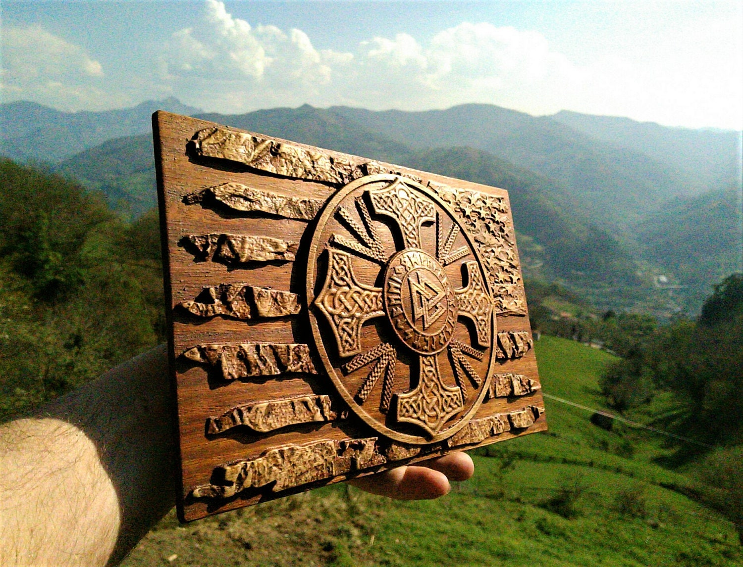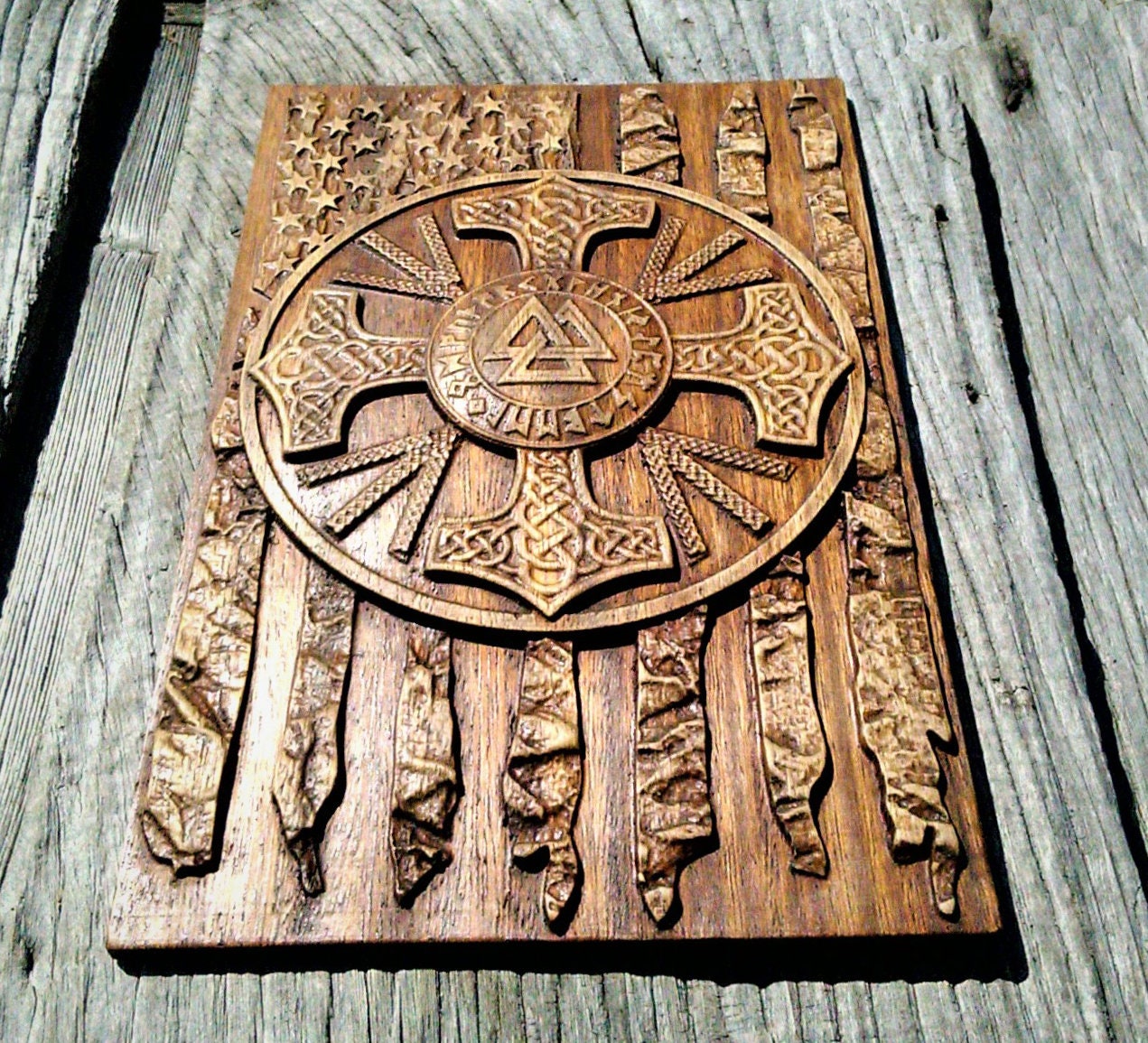 American Flag Viking Plaque – Hand Carved Iroko Wood Norse Decor