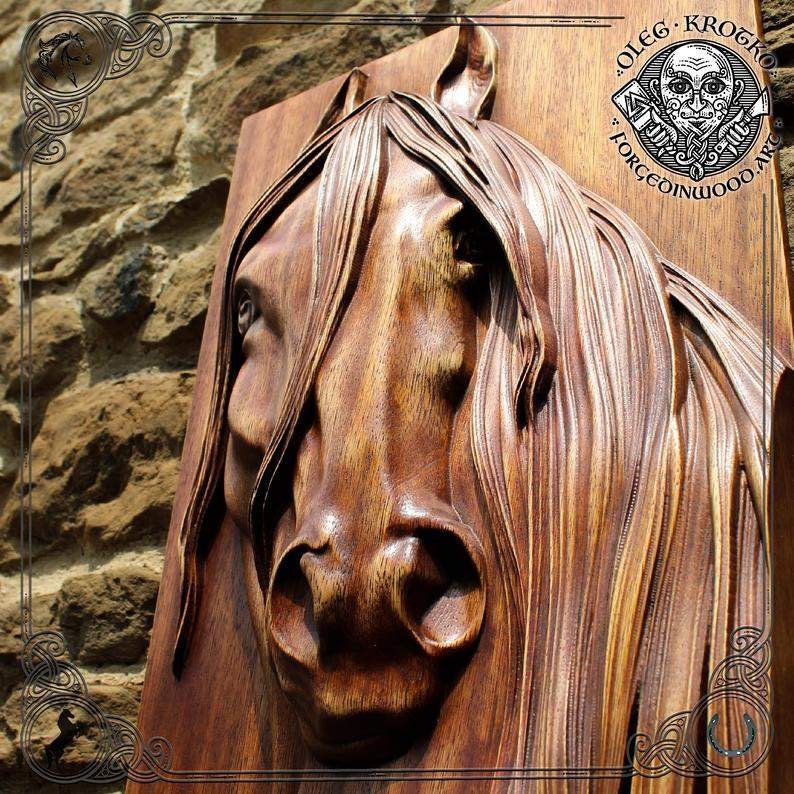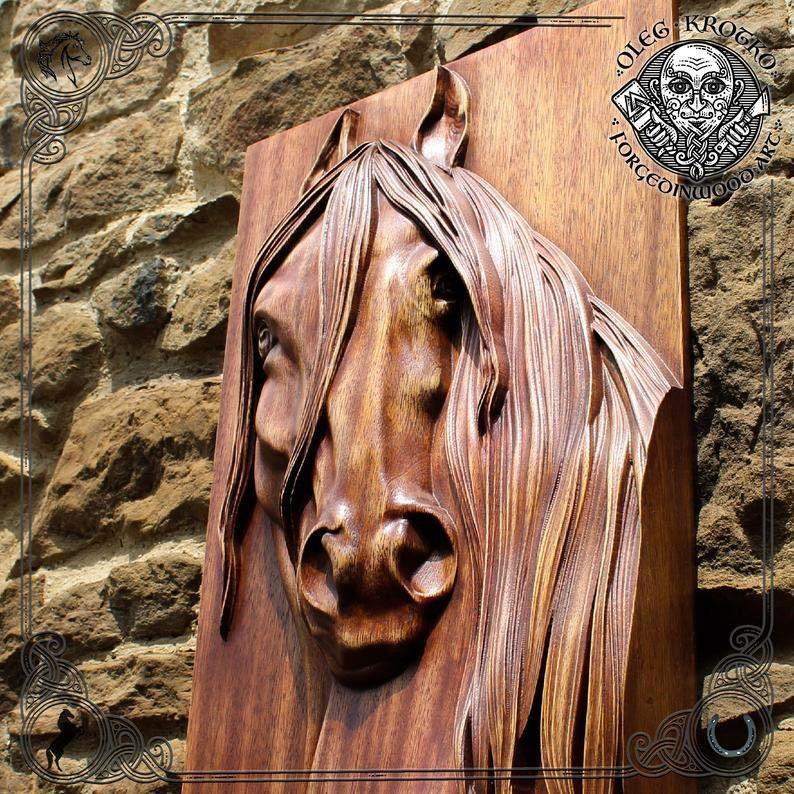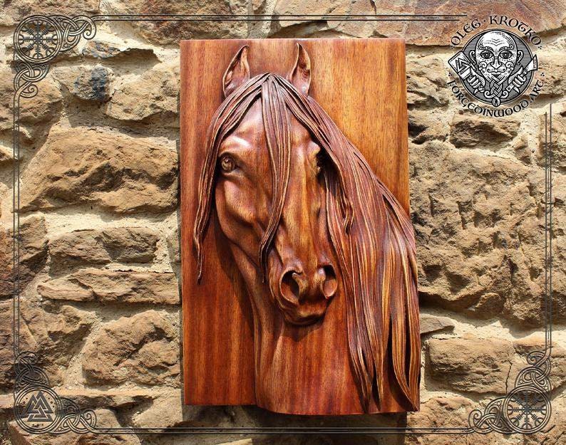 Carved Wooden Horse Portrait, Wood Relief Wall Decor, Oleg Krotko