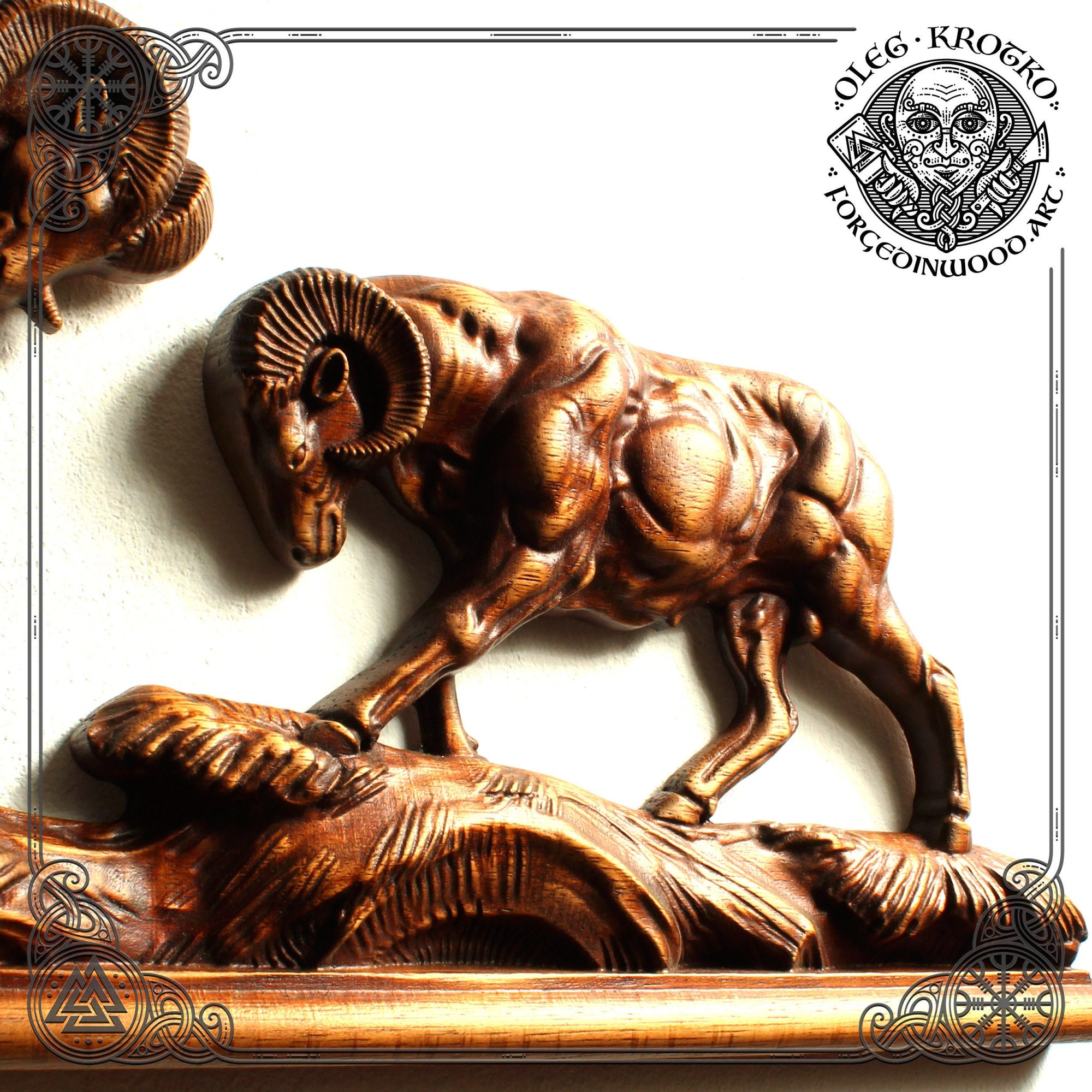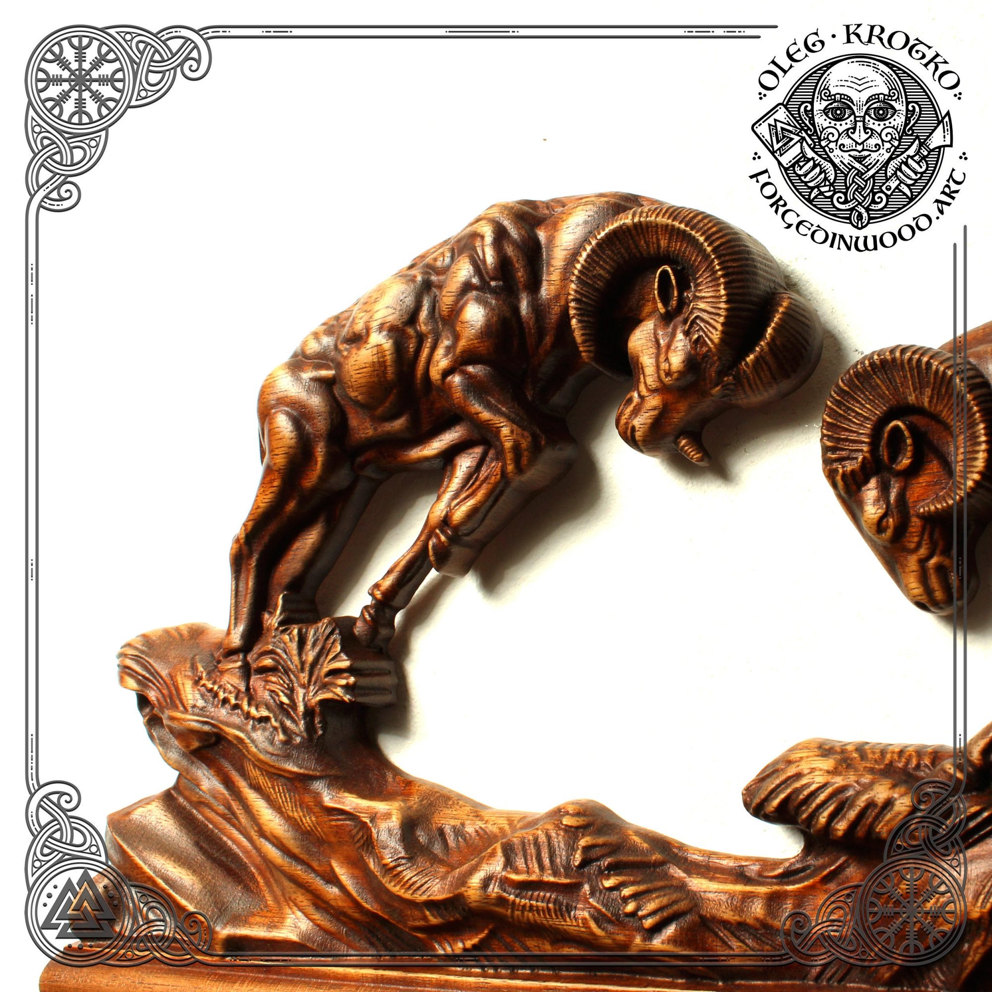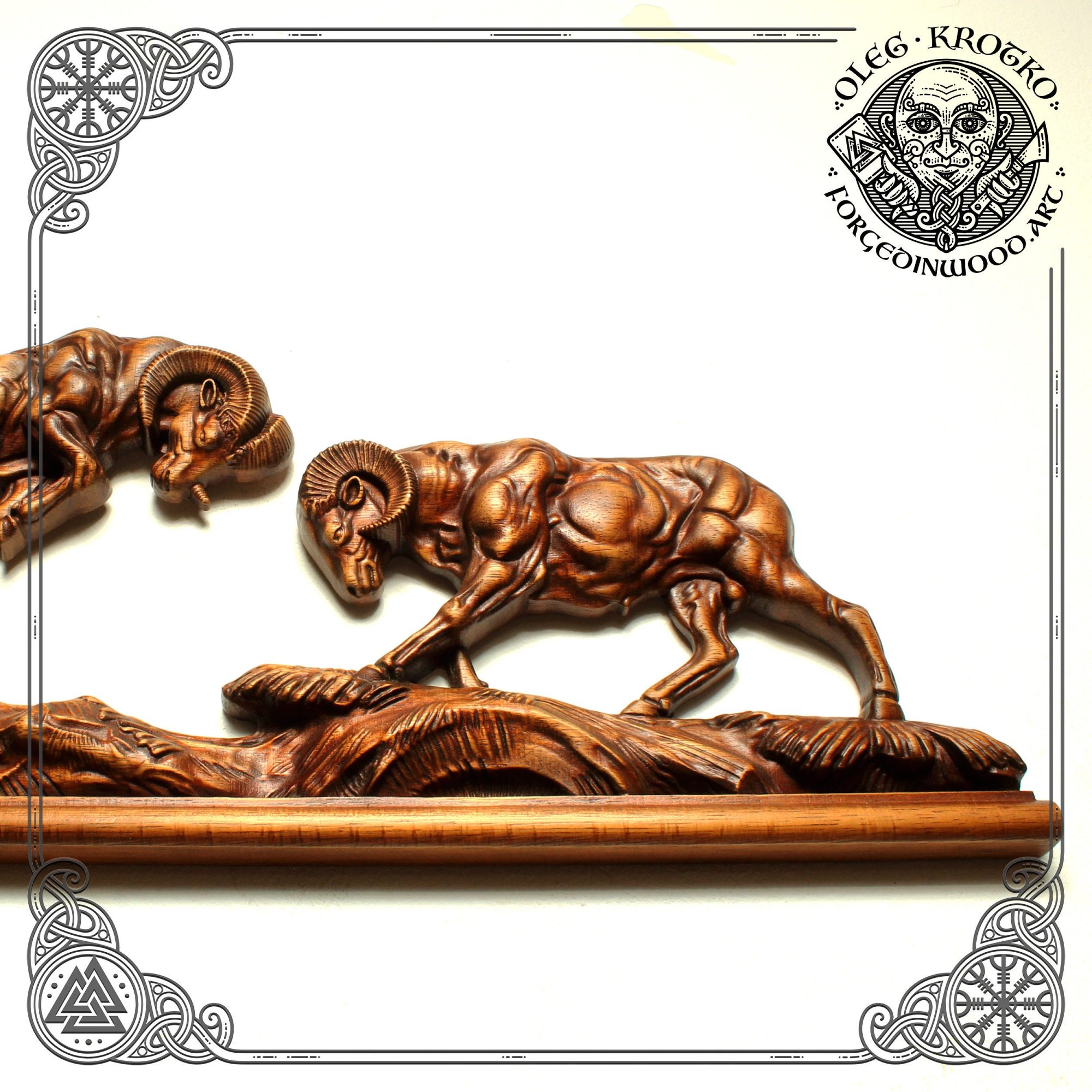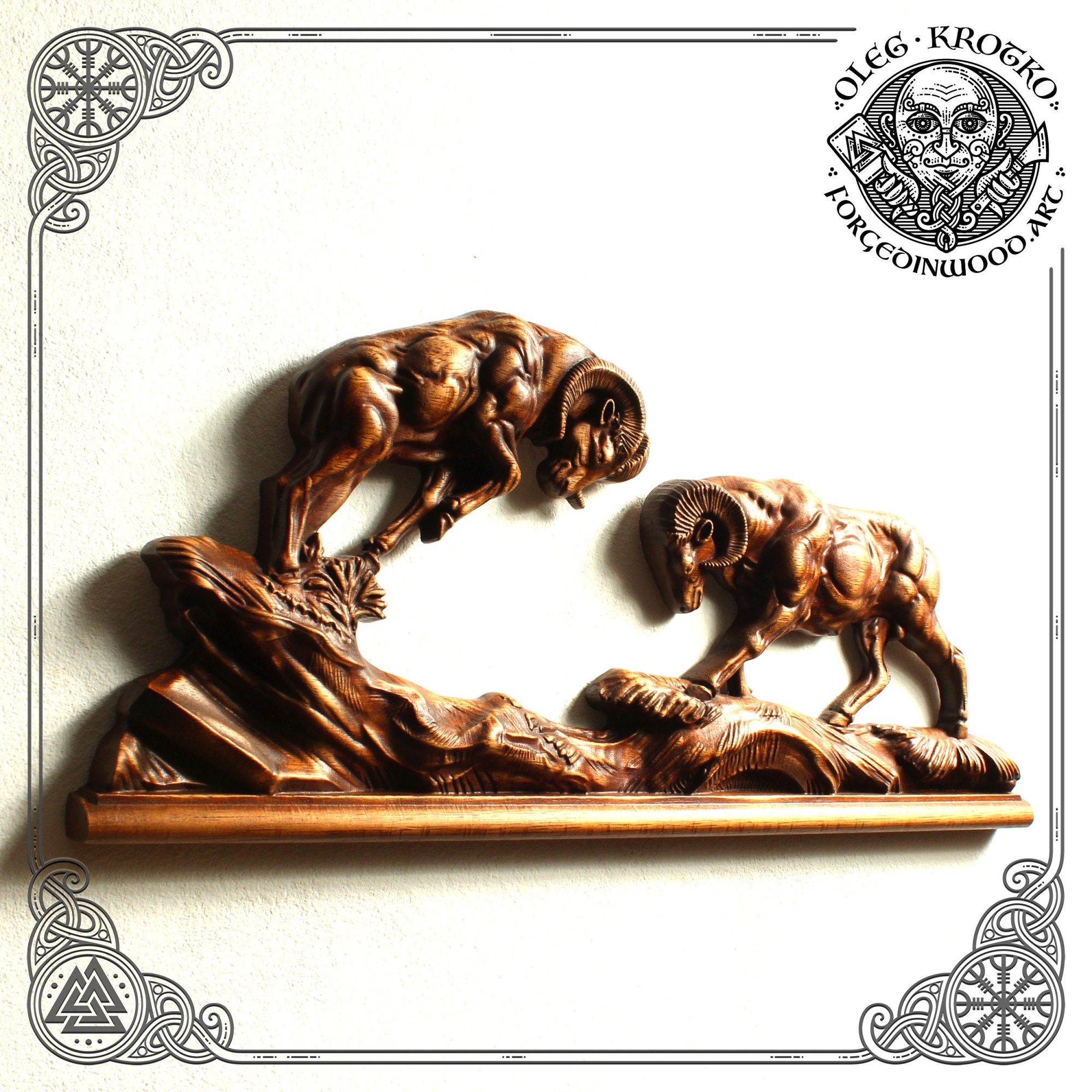 Iroko Wood Carved Fighting Goats, Rustic Cabin Wall Art (20.5×9 inches)