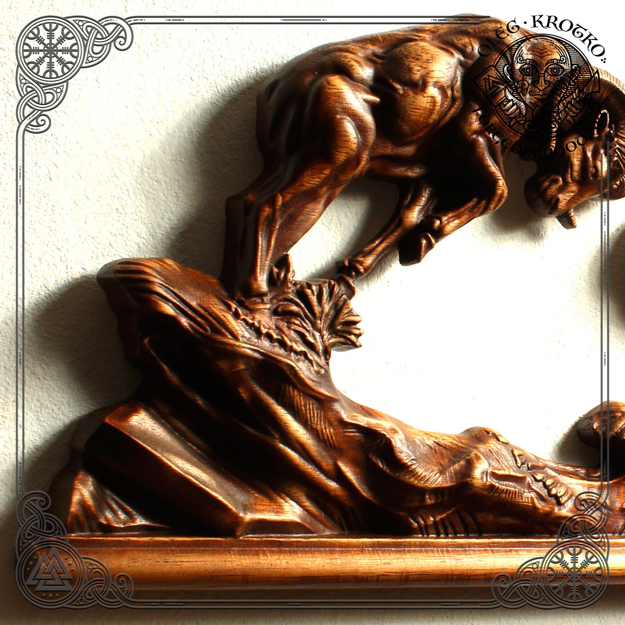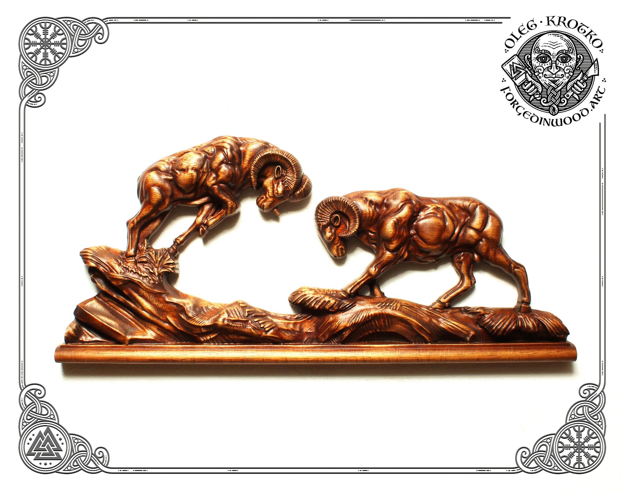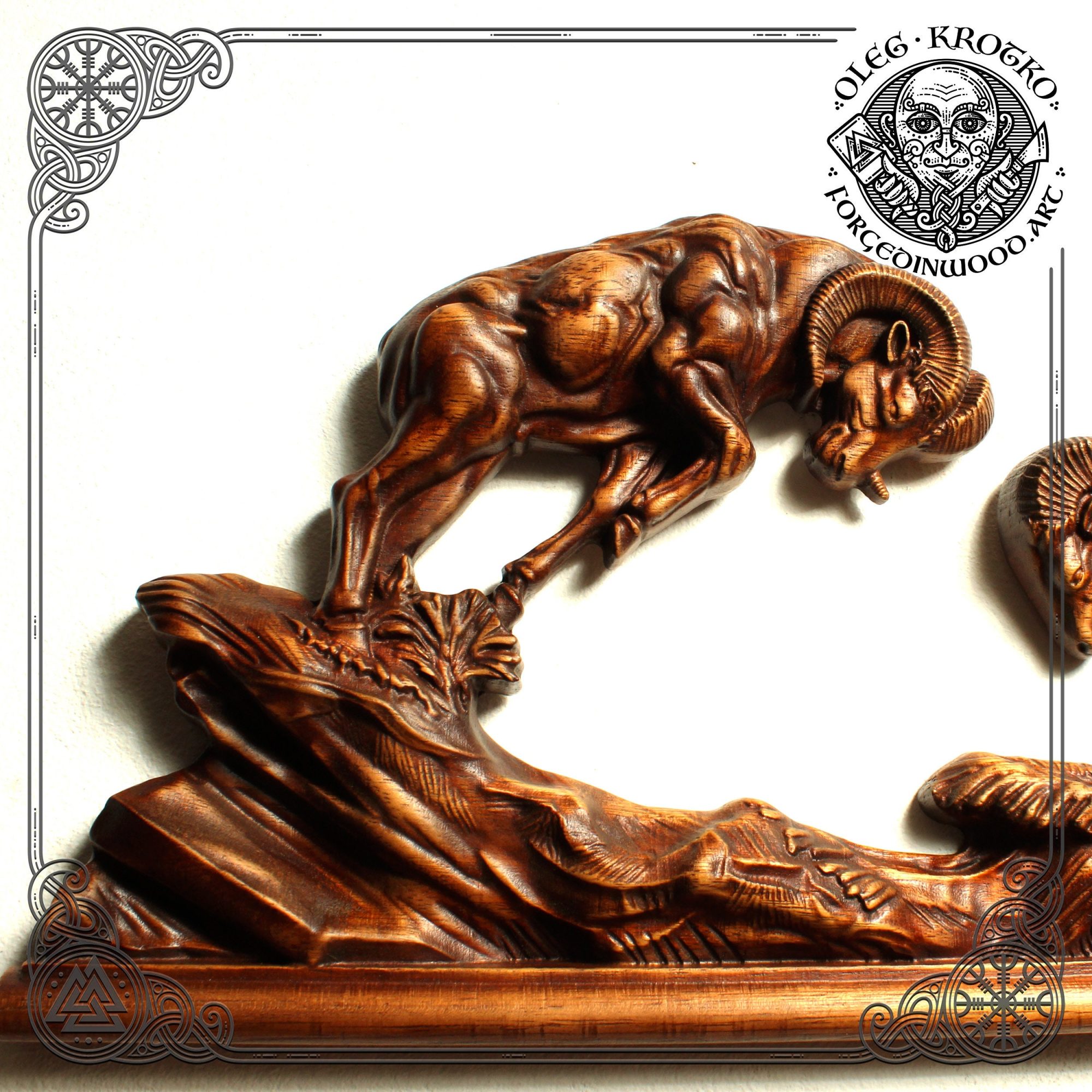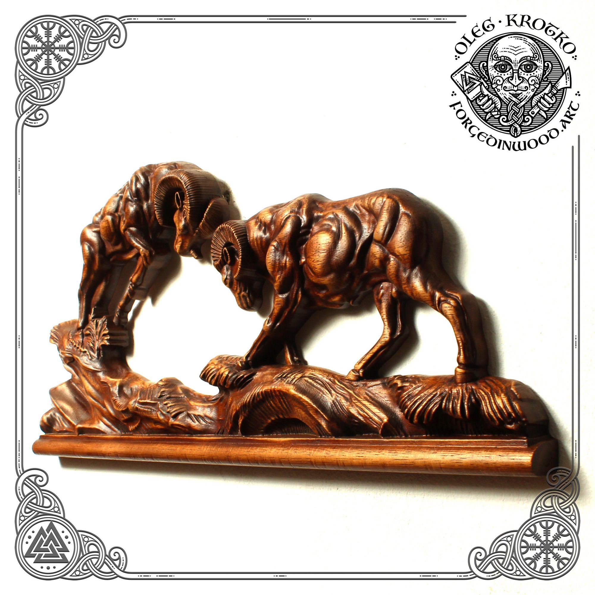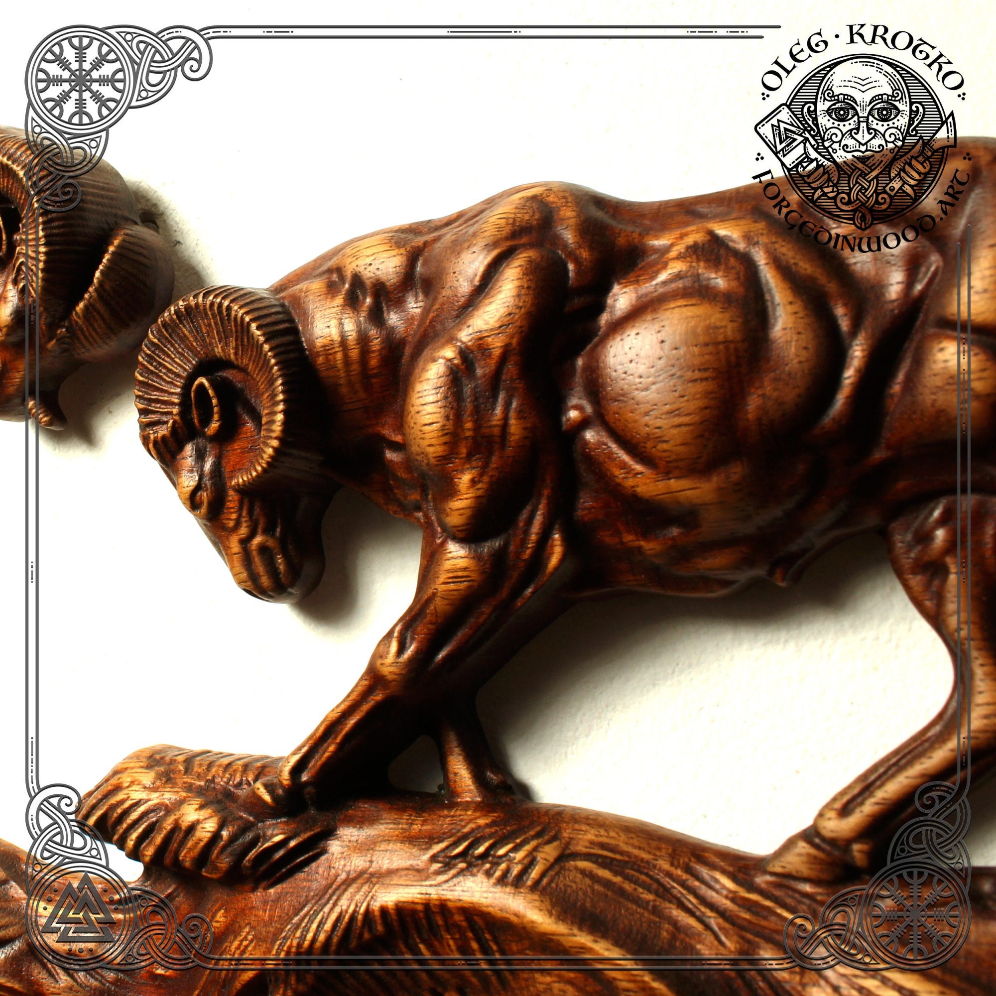 Iroko Wood Carved Fighting Goats, Rustic Cabin Wall Art (20.5×9 inches)