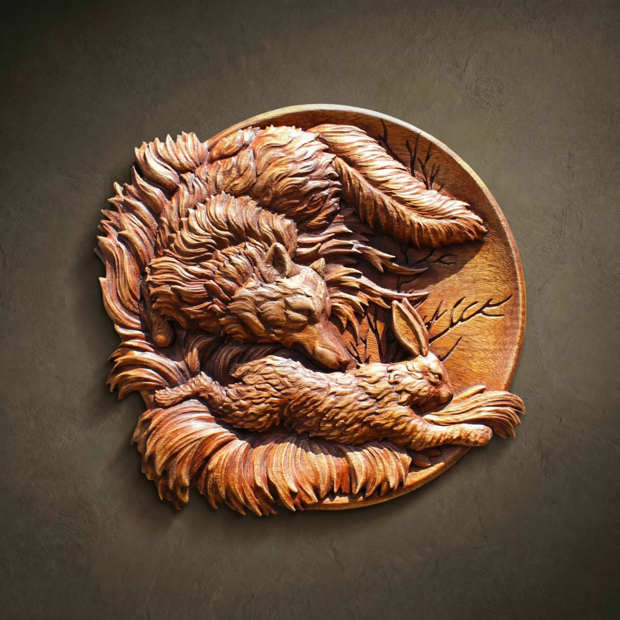 Iroko Wood Carving – Fox and Hare Rustic Wall Art